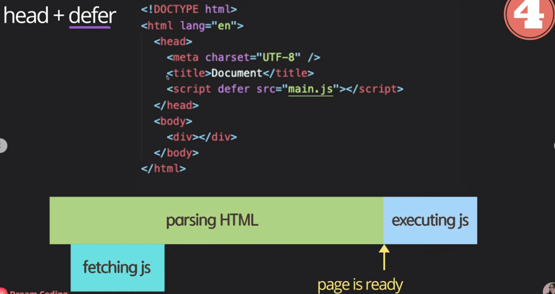 하지만 이 자바스크립트가 html이 parsing되기도 전에 실행이 되기 때문에