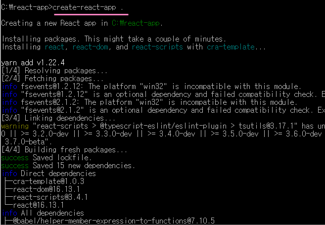 create-react-app . (점을 꼭 적어준다)이라고 입력하면 리액트 환경이 만들어진다.