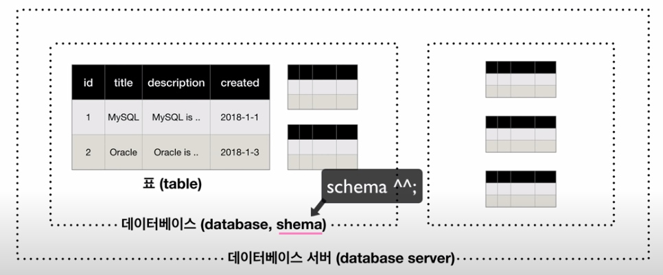 '스키마' 라는 표현을 같이 쓰는데 이는 표들을 그룹핑하는 일종의 폴더라고 생각하면 된다.