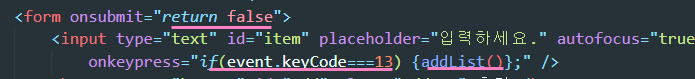 2. 13은 엔터키를 의미한다. 엔터를 누르면 addList 함수가 실행됨.