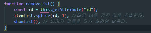 itemList.splice(id, 1); //해당 id를 가진 값을 추출한다.