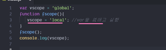함수안에 var vscope = 'local'로 변수를 선언했을때는 별도의 vscope이 선언된것이므로 결과값이 global이 나오지만