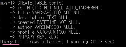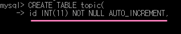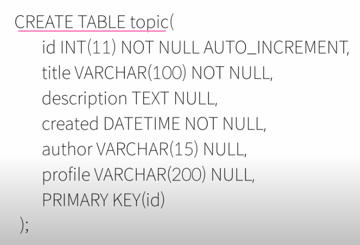 PRIMARY KEY(id) 는 데이터베이스에게 우리가 생성하는 topic table에 id열이 main key라고 알려주는 것이다.
