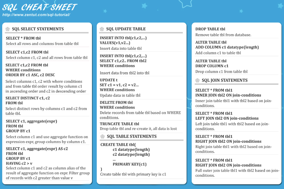 cheat sheet를 보고 테이블을 작성해보자. (검색해서 다른 자료를 찾아도 좋다.)