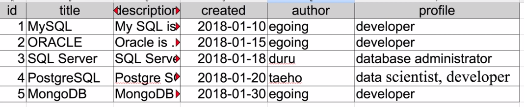 표를 table이라고 부르고 표의 수평을 row, record, 행이라고 부른다.