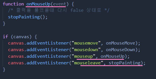 onMouseUp 도 mouseleave처럼 stopPainting을 넣어서 line logic을 넣지않겠다.